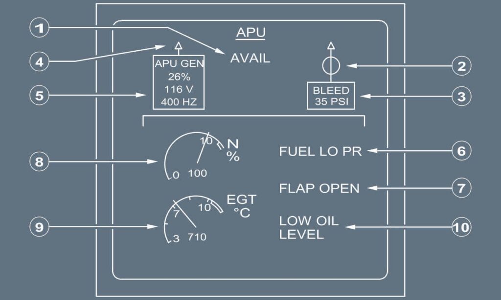 System indications, including APU speed (N), exhaust gas temperature (EGT), and generator status, are displayed on the ECAM system. The crew does not manually control fuel flow, ignition, or acceleration; all these functions are handled automatically by the ECB.